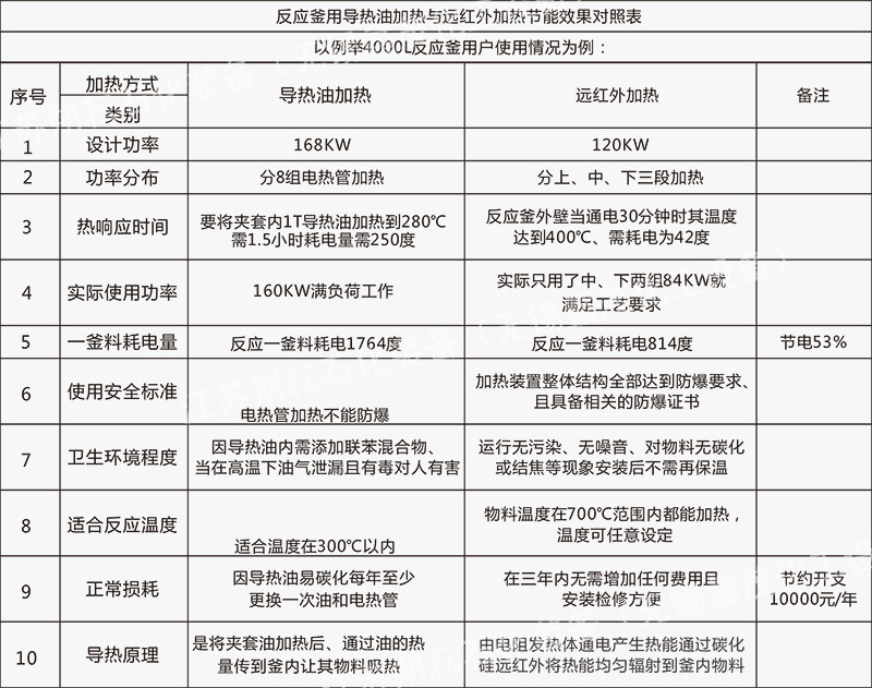 遠紅外電加熱裝置具有加熱面積大,升溫平穩而快,放熱均勻,溫度控制方便,可上、中、下分段控制,釜內釜壁溫度易控制,運行無噪音,無污染,使用壽命長,節能好。加熱器溫度可在常溫到800℃范圍內設定。為滿足用戶需求,將加熱設備又進行改造,使加熱裝置整體達到防爆要求,從而解決了用戶一直擔心且其它加熱方法不能解決的防爆難題。
